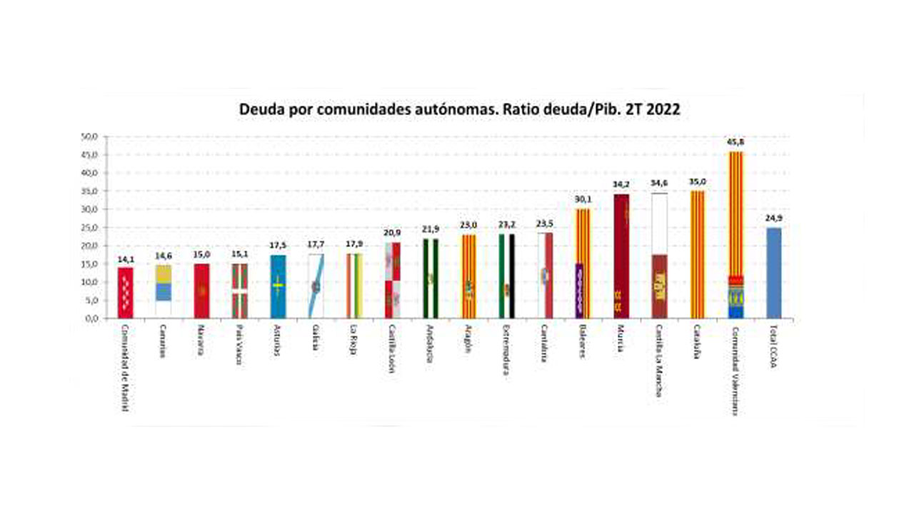 Con respecto al resto de CCAA, el endeudamiento de la Comunidad de Madrid es 2,5 veces menor que el de Cataluña (35%) y Castilla-La Mancha (34,6%) y se sitúa 3,2 veces por debajo de la Comunidad Valenciana (45,8%).