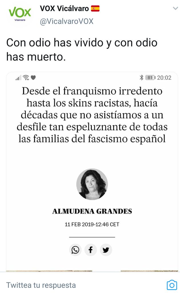Junto a estas palabras, una captura de uno de los artículos de Grandes, el que escribió en febrero de 2019 sobre la llamada ‘foto de Colón’ y que definió como “desfile espeluznante de todas las familias del fascismo español”.