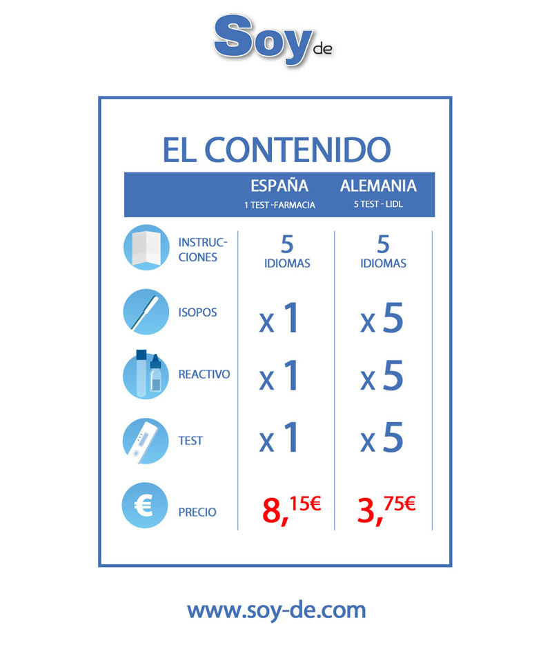 La espera de los test es la misma, menos de 20 minutos y los resultados, ambos negativos, tampoco tienen ninguna diferencia, pero en Alemania se paga 0,75€ en un supermercado y en España 8,15€ por unidad en una farmacia. ¿Por qué siendo de la misma marca y teniendo la misma eficacia en España se paga más que en Alemania?