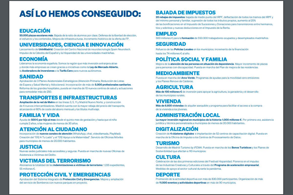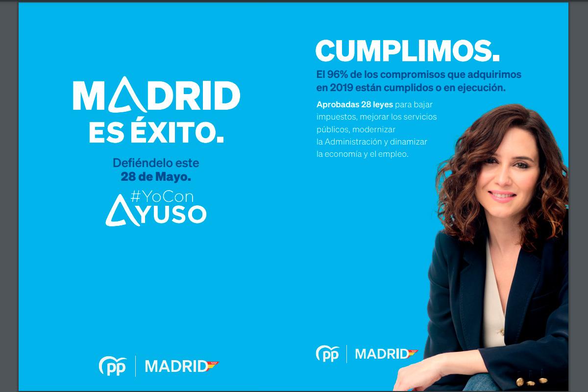 Esta campaña popular también pone en valor algunos datos económicos: Madrid es la región que más inversión extranjera atrae y donde más empresas se crean gracias a la Ley de Mercado Abierto, la de Aceleración de Inversiones o la Tarifa Cero para nuevos autónomos. Asimismo, el PP de Madrid ha bajado medio punto del IRPF, del mínimo personal y familiar, así como la supresión de todos los impuestos propios.