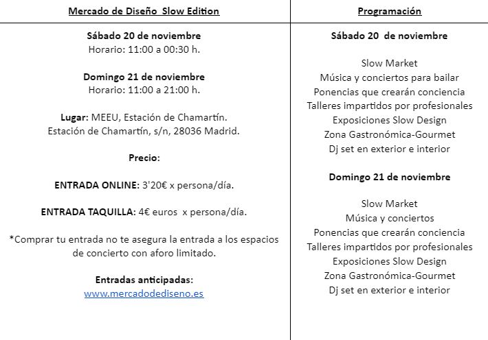 Entrada para sábado o domingo ya a la venta. Mercado de Diseño Slow Edition está compuesto por una gran cantidad de espacios y zonas, cada una dedicada a un aspecto concreto del evento. Los asistentes podrán moverse por el espacio libremente para disfrutar de una deliciosa selección de street food que ofreceremos, ver los stands de diseñadores, asistir a los talleres, exposiciones, etc. Sin embargo, la entrada no asegura al asistente el acceso a la zona de conciertos ya que cuenta con aforo limitado.