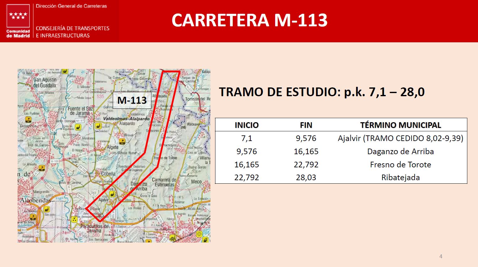 La Comunidad de Madrid invertirá 1,4 millones de euros en reparar un tramo de 21 kilómetros de la M-113, a su paso por los municipios de Ajalvir, Daganzo de Arriba, Fresno de Torote, Serracines y Ribatejada, con el objetivo de mejorar la seguridad de esta carretera. Así lo ha avanzado hoy el consejero de Transportes e Infraestructuras, David Pérez, quien ha mantenido un encuentro con los alcaldes de la zona y les ha explicado las actuaciones que se van a poner en marcha en esta vía de titularidad regional.