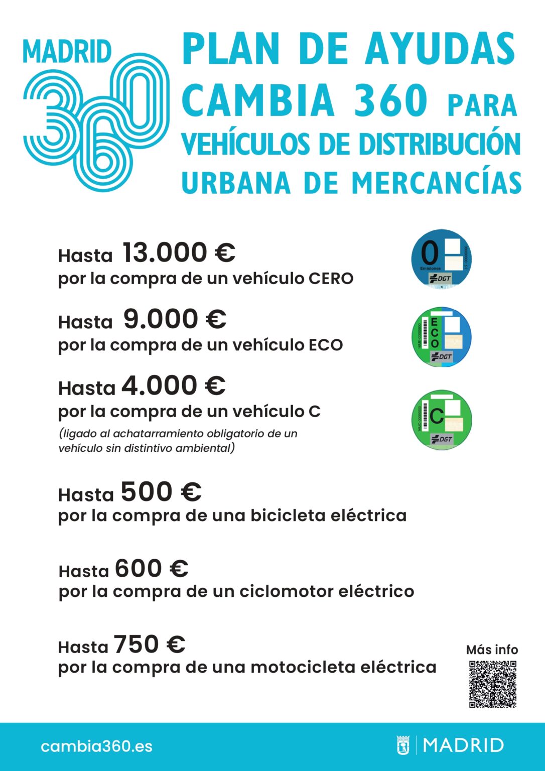 El Ayuntamiento de Madrid ha reservado 2 millones de euros dentro del Plan Cambia 360 para financiar subvenciones para el fomento de la movilidad sostenible en la distribución urbana de mercancías (DUM). Desde el día 11 de noviembre hasta el 25 de noviembre en los concesionarios adheridos.