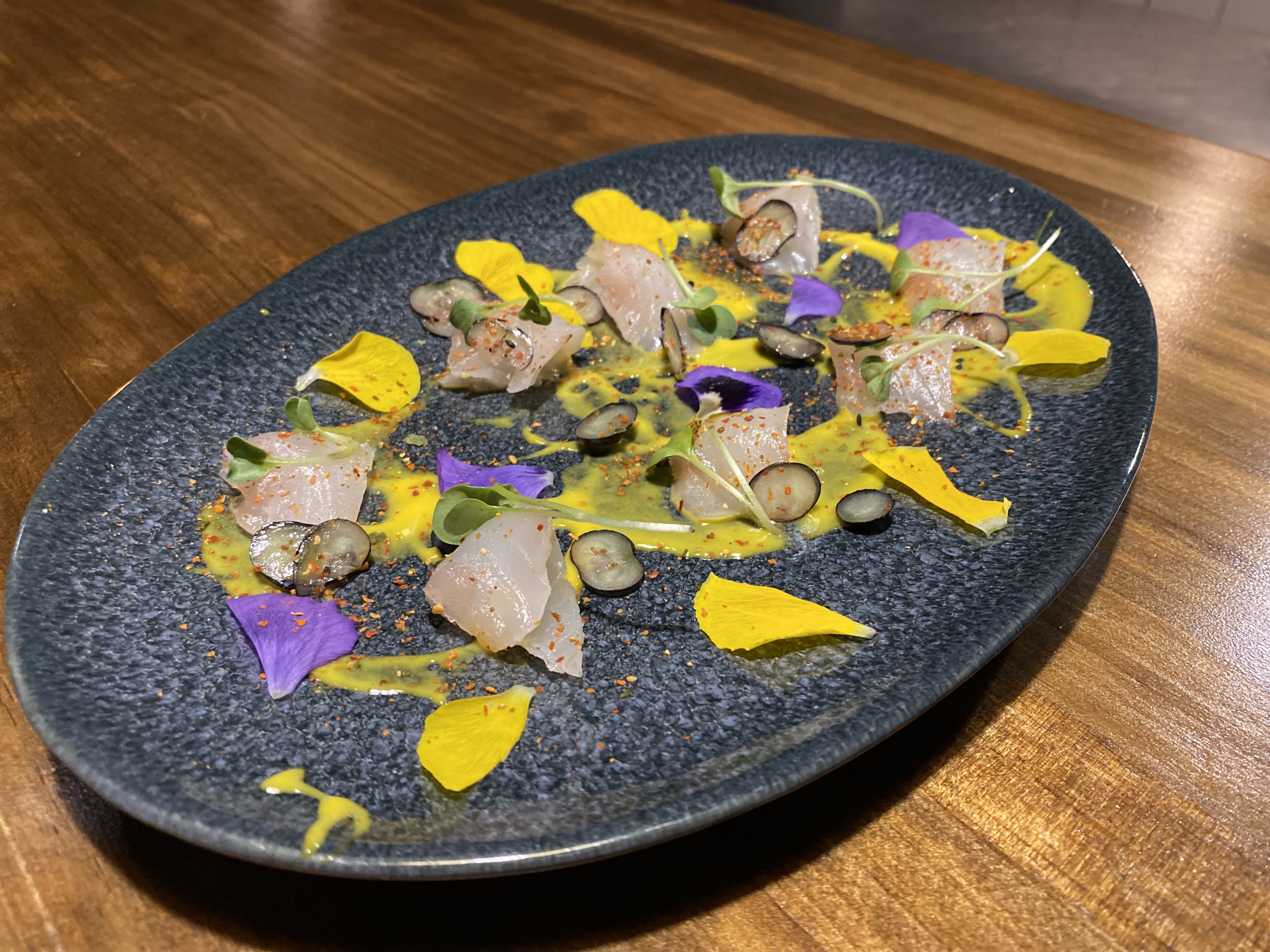 Usuzukuri de lubina salvaje, con salsa de ají mango y brotes de cilantro y remolacha