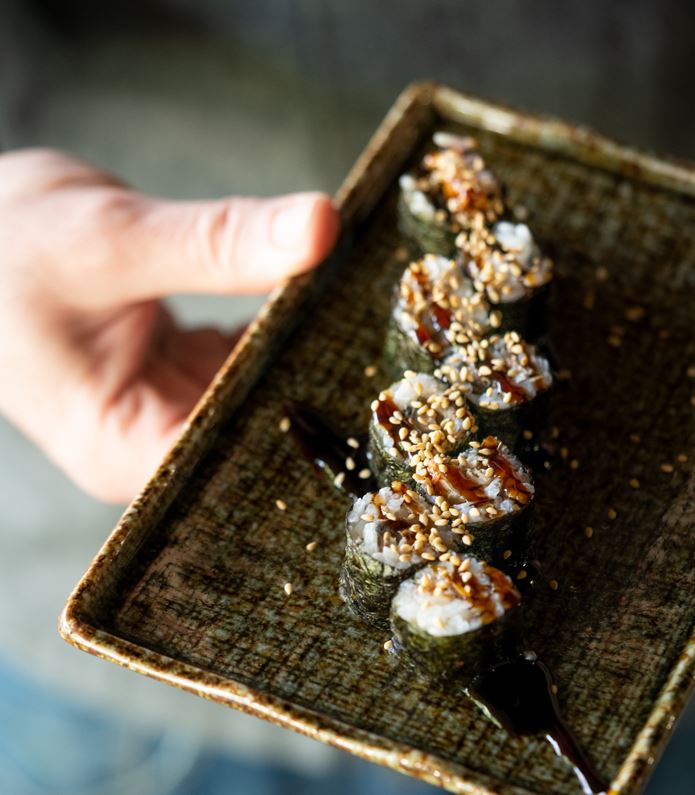 Hosomaki de anguila, lascas de coco, teriyaki y sésamo Blanco tostado