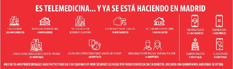 La telemedicina también se está utilizando para mejorar la formación de los profesionales de la sanidad madrileña. Desde el inicio de la pandemia de COVID19, más de 58.000 han participado en 580 seminarios web y se impulsan sesiones clínicas por videoconferencia en directo, incluso con quirófanos mientras se opera.