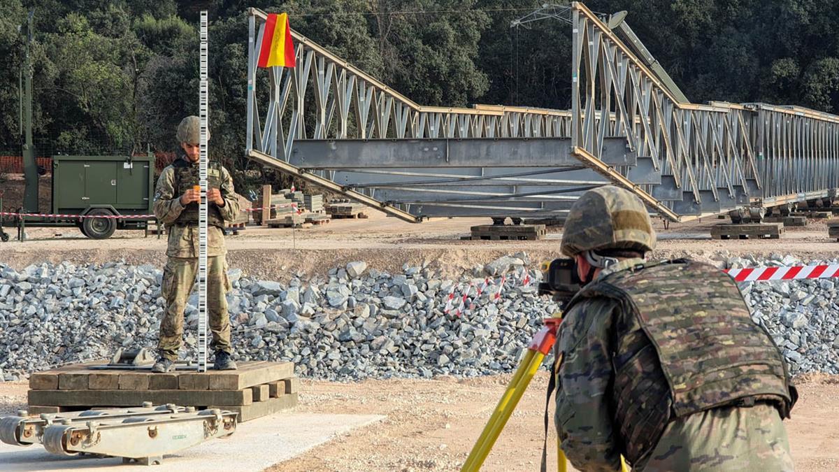 Medio centenar de efectivos de la Unidad de Tendido del REI 11 del Ejército de Tierra trabajan ya en la instalación del puente Mabey, el cual facilitará el tránsito de vehículos entre las localidades de Aldea del Fresno y Villamanta tras la destrucción durante el virulento paso de la DANA de las infraestructuras que posibilitaban las comunicaciones por carretera en la zona.
