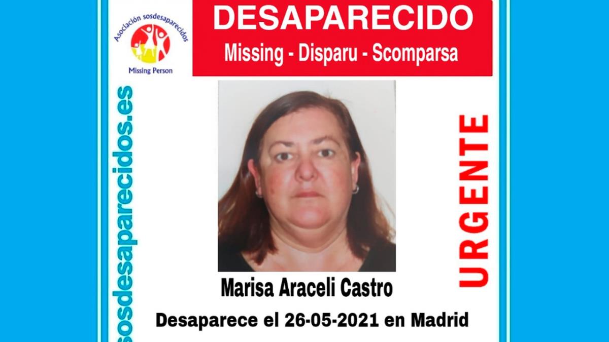 Marisa tiene 59 años y desapareció el 26 de mayo de 2021 en Madrid. Entre los datos que se facilitan para ayudar en la búsqueda, indican que mide 1,60 metros, tiene el pelo castaño, los ojos castaños y saltones y es de complexión gruesa. Además, cuenta con una mancha oscura en el ojo derecho.