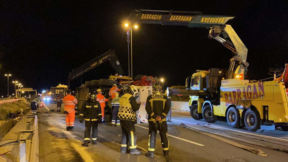 En esta línea, los operarios de la grúa han conseguido izar el camión bajo la supervisión de los Bomberos. A las 7:30 de la mañana solo se podía circular por las vías de servicio.