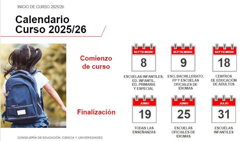 Por otro lado, el curso terminará el 19 de junio del año que viene para todas las enseñanzas, el 25 para las Escuelas Oficiales de Idiomas, y el 31 de julio será el final del curso para las escuelas infantiles.