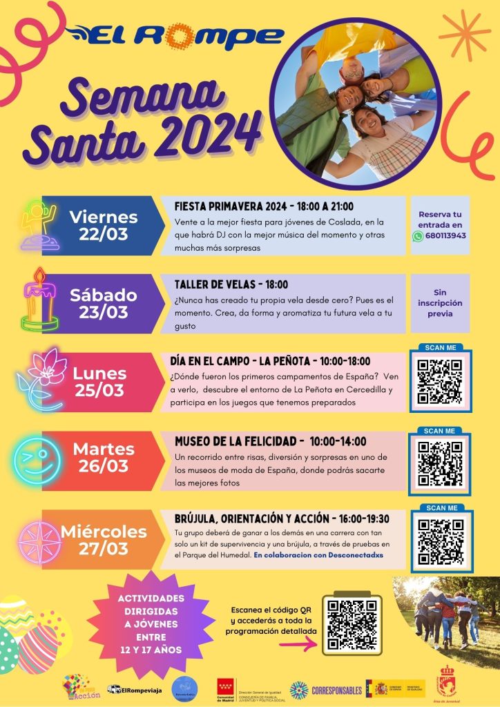 El Área de Juventud del Ayuntamiento de Coslada, a través de su espacio de encuentro El Rompeolas, ofrece una serie de actividades en Semana Santa para jóvenes del municipio con edades comprendidas entre 12 y 17 años.  El plazo de inscripción de estas actividades finaliza el 15 de marzo y ha de realizarse a través de la web redjovencoslada.es.