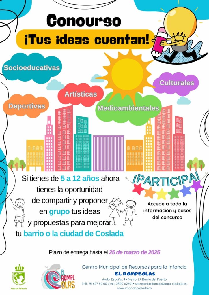 La Concejalía de Infancia y Juventud de Coslada, en colaboración con la Concejalía de Educación, amplía el plazo de presentación de propuestas para el concurso Tus ideas cuentan hasta el 25 de marzo de 2025.
