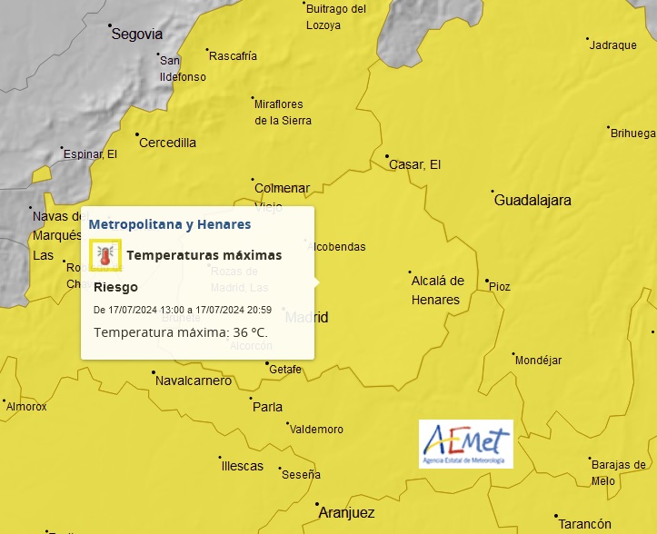 La Agencia Estatal de Agencia Estatal de Meteorología (AEMET) ha activado un aviso amarillo por riesgo de temperaturas máximas de 36 ºC en esta zona hoy, entre las 13.00 y las 21.00 horas, y un aviso naranja por riesgo importante de temperaturas máximas de 39 ºC el jueves y 40ºC el viernes, igualmente de 13.00 a 21.00 horas.