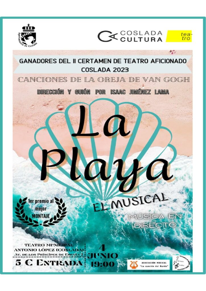 El ayuntamiento de Coslada informa de que este domingo 4 de junio se representa en el Teatro Municipal de Coslada "La Playa, el musical" de la Compañía La Canción del Bardo, que ha resultado vencedora del premio al mejor montaje en el II Certamen de Teatro Aficionado de Coslada.