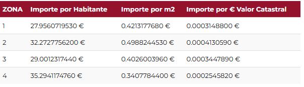 Por ejemplo, si una vivienda está dentro de la zona 1, con cuatro habitantes, una superficie de 100 m² y un valor catastral de 100.000 € pagará una tasa de 185,44 €. Un cálculo que procede de los datos obtenidos dentro de la zona 1, es decir, al ser 4 habitantes son 111,82 € (4 x 27,9560719530 €) y la suma de los otros dos factores que serían por superficie 42,13 € (100 x 0,4213177680 €) y el valor catastral asciende a 31,48 € (100.000 x 0.0003148800 €).