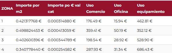 Por ejemplo, si un local está dentro de la zona 3, una superficie de 300 m², un valor catastral de 300.000 €, y un uso comercial pagará una tasa de 422,75 €. Un cálculo que procede de los datos obtenidos dentro de la zona 1, es decir, al ser comercial son 198,54 € y la suma de los otros dos factores que serían por superficie 120,78 € (300 x 0,402600396 €) y el valor catastral asciende a 103,43 € (300.000 x 0.000344789 €).