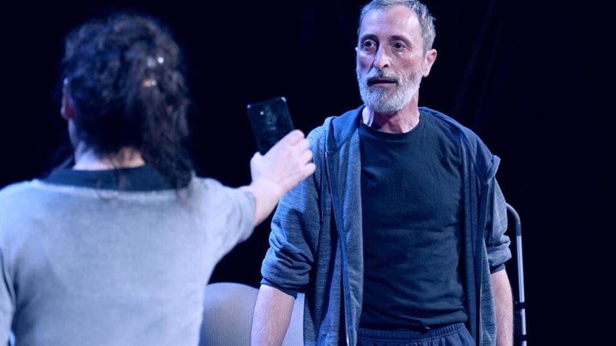 En el escenario un actor, una actriz y un músico.
