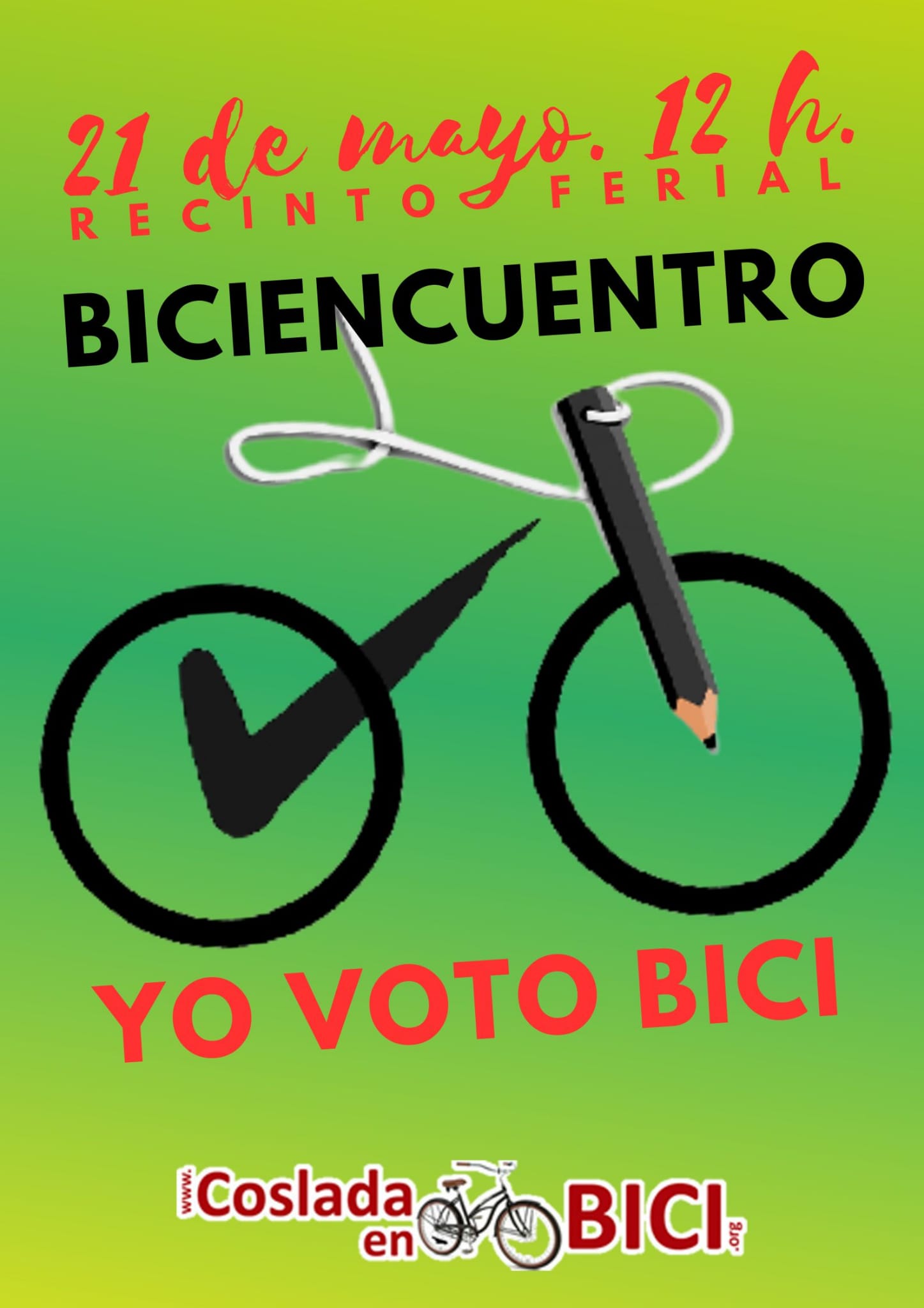 Será en el tradicional BICIENCUENTRO que se celebra cada penúltimo domingo de mes, desde las 12:00 h. saliendo del recinto ferial. Los Biciencuentros, similares a las "bici-críticas" que recorren una vez al mes miles de ciudades del planeta, son recorridos tranquilos en bici por las calles de Coslada. Son, seguramente el más duradero y presente movimiento social de la ciudad que une reivindicación con la alegría de moverse en bicicleta por los trayectos más cotidianos.