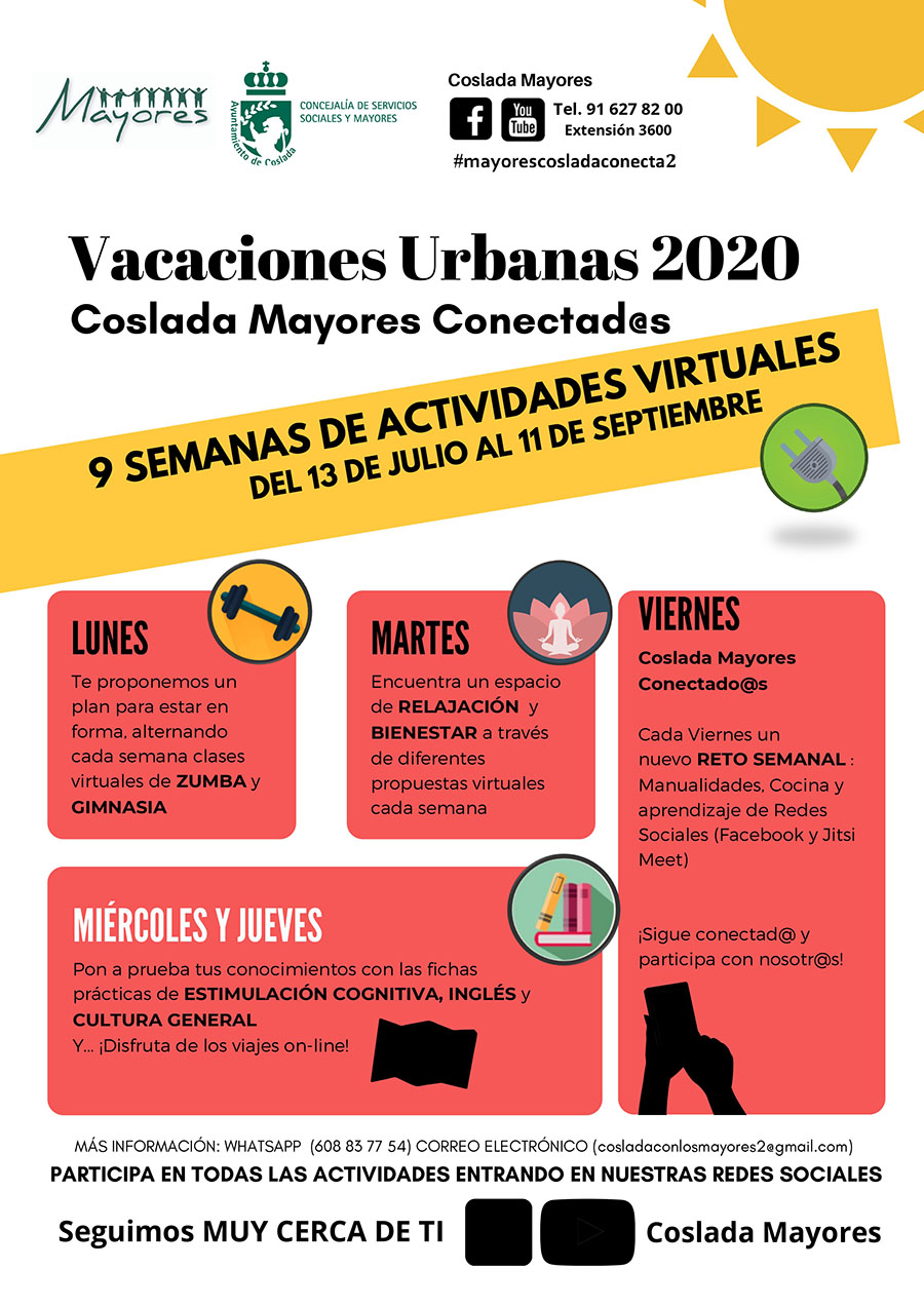 La pandemia ha provocado que numerosos servicios municipales no puedan realizarse este verano 2020, aunque se han encontrado alternativas. El Ayuntamiento de Coslada ha anunciado este lunes 13 de julio que su Concejalía de Mayores, ha creado una amplia cantidad de actividades virtuales para este verano para los vecinos mayores del municipio.