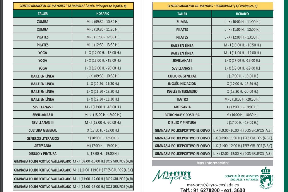 Zumba, pilates, yoga, baile, artesanía, dibujo, gimnasia e, incluso, cursos de inglés son algunas de las propuestas más prometedoras de estas jornadas. Los horarios oscilan entre la mañana y la tarde, dando lugar a actividades en horario matinal como zumba, pilates, baile o gimnasia, y en horario vespertino, como sevillanas, cultura general, dibujo o teatro.