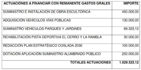 El Equipo de Gobierno ha decidido invertir la cantidad de 1.029.323,12€ en las siguientes partidas que se reflejan a continuación: