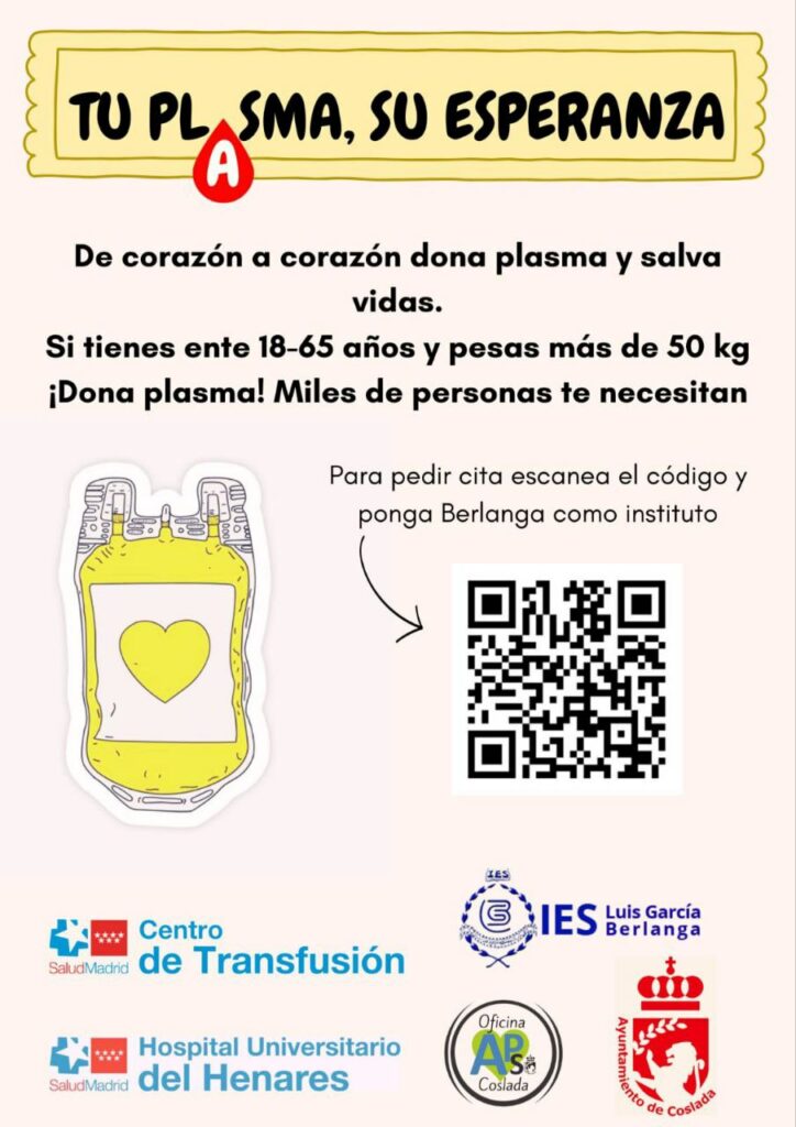 Durante el curso escolar que acaba de finalizar y con la profesora de Biología Carmen García al frente del proyecto, el alumnado de 3º de ESO del IES Luis García Berlanga ha diseñado el cartel de esta campaña de donación de plasma, así como el eslogan para su difusión, ‘Tu plasma, su esperanza’. Los y las jóvenes también han aprendido cómo se obtiene este plasma, ya sea a partir de las donaciones de sangre convencionales o por el procedimiento conocido como plasmaféresis.