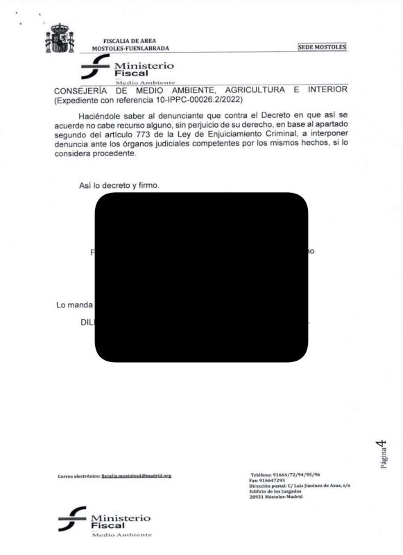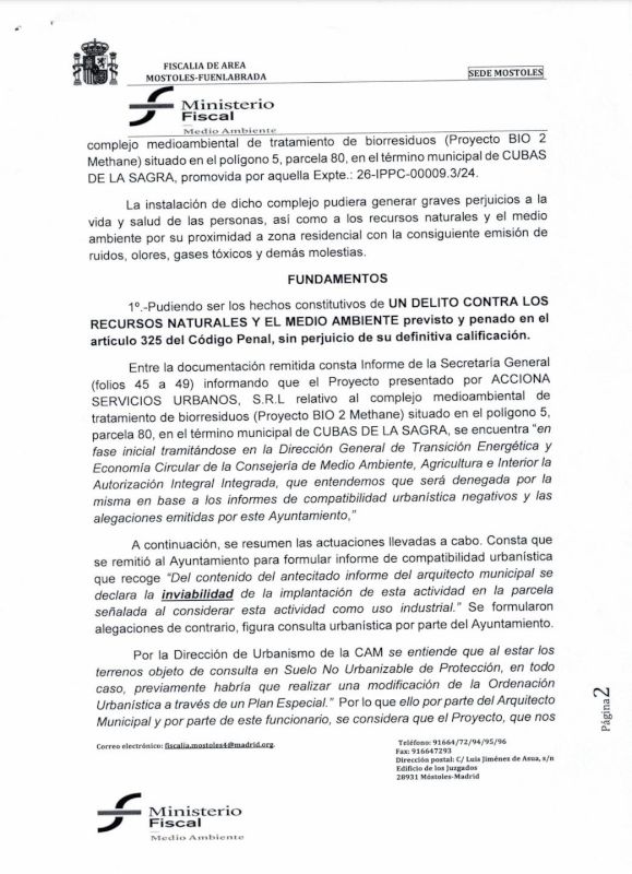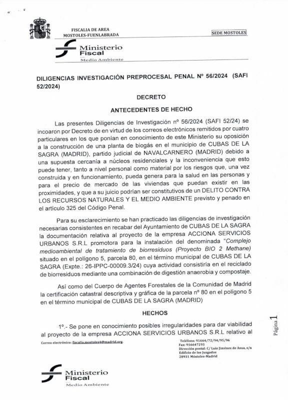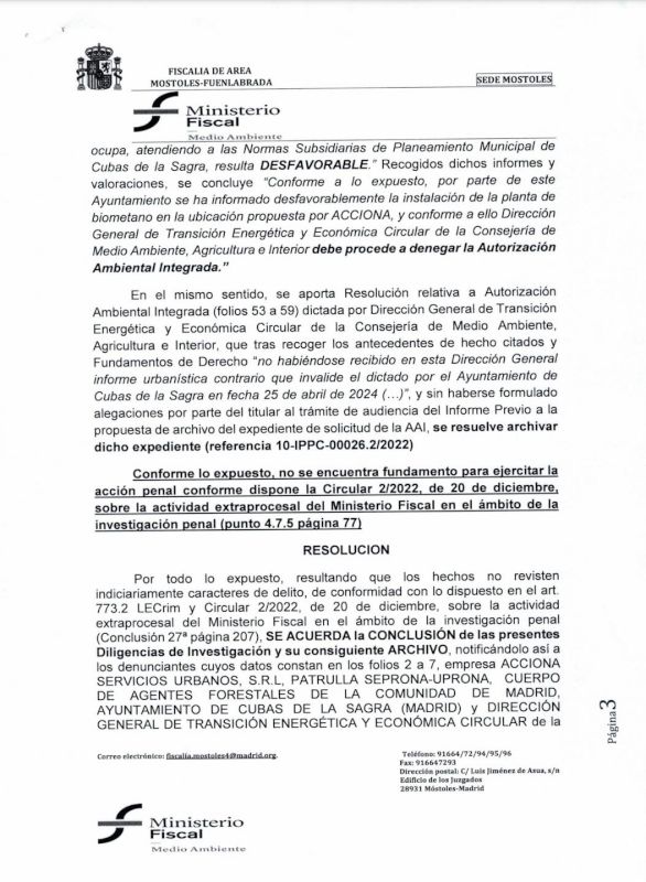 La Fiscalía recabó por parte del Ayuntamiento de Cubas de la Sagra y de la empresa promotora del proyecto, Acciona, al documentación pertinente que se incluía en el expediente de Declaración Ambiental Integrada que tenía abierto la Consejería de Medioambiente de la Comunidad de Madrid. Tras estudiar dicha documentación y acceder al informe de compatibilidad urbanística negativo del arquitecto municipal, así como al desestimiento de la empresa Acciona a presentar alegaciones que motivó el archivo del expediente, el Ministerio Fiscal acordó archivar las diligencias ya que "no se encuentra fundamento para ejercitar acción penal".