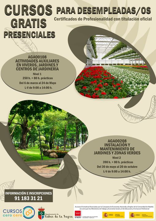 - Nivel 1. Actividades auxiliares en viveros, jardines y centros de jardinería que consiste en 250 horas + 80 horas de prácticas. El curso se impartirá del 6 de marzo al día 24 de mayo de lunes a viernes de 9:00 a 14:00.