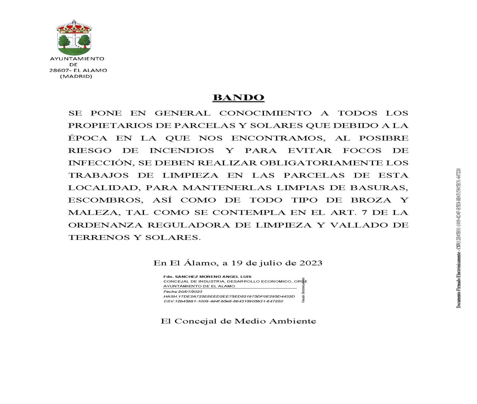 A través de un bando publicado en la página web municipal, el Ayuntamiento de El Álamo, a través de la concejalía de Medio Ambiente, ha recordado a los propietarios de parcelas y solares la obligatoriedad de realizar las labores pertinentes de limpieza y retirada de basuras en estos terrenos, con el fin "evitar focos de infección" y "prevenir un posible riesgo de incendios", peligros especialmente presentes en esta época del año, con las altas temperaturas típicas del verano en la zona.