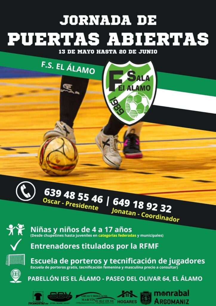 Gracias a unas jornadas de puertas abiertas en el Fútbol Sala El Álamo, niños y jóvenes de 4 a 17 años pueden jugar y entrenar a modo de prueba para el año que viene. Los chicos y chicas que quieran poner a prueba su habilidad en este deporte pueden contactar con el club para asistir a estas sesiones, que tendrán lugar hasta el próximo 20 de junio.