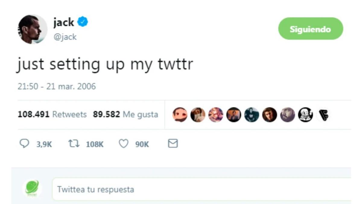 Este tweet, el primer tweet de la historia, obra de Jack Dorsey, el CEO de Twitter, fue vendido por 2,5 millones de euros como NFT