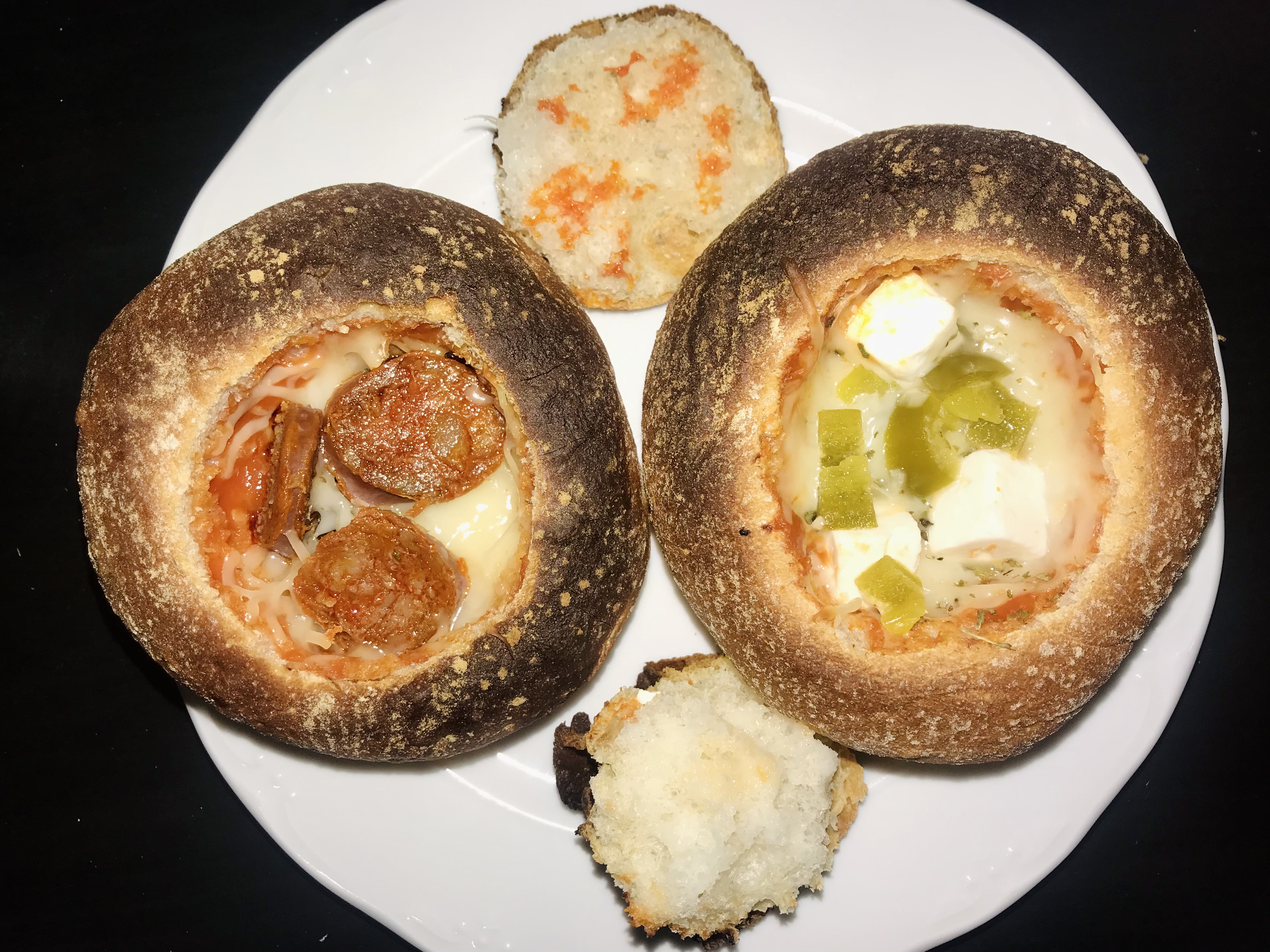 El entrante de nuestra comida tiktoker consiste en un pan estilo mollete a rellenar con ingredientes al gusto. Nosotros hemos optado por tres versiones: una con diferentes quesos y jalapeño, otra de tomate, queso rallado y huevo; y la última, tomate frito, queso rallado y chorizo.