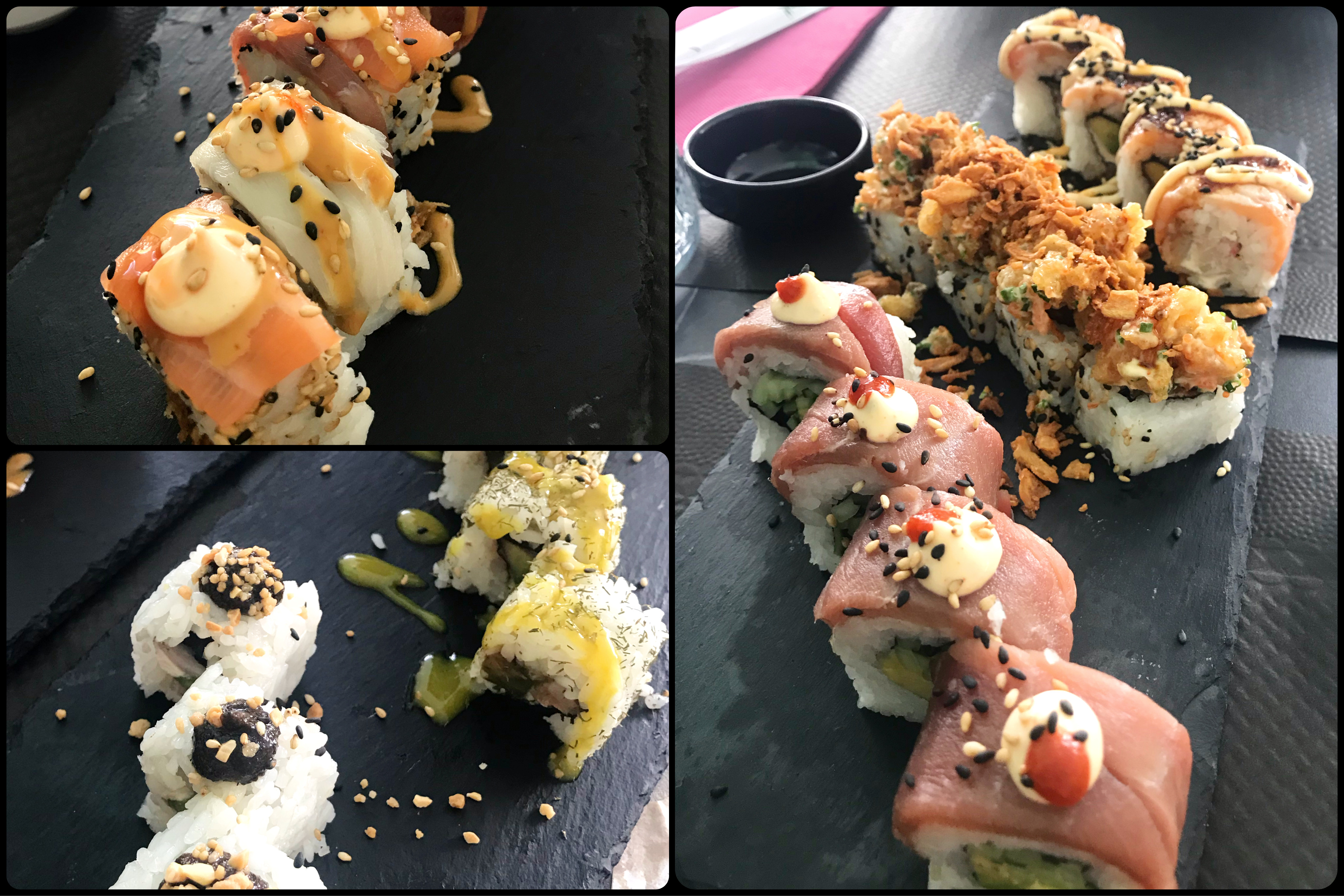 En mi visita al local, empecé con la tradicional ensalada de algas wakame y unas gyozas de langostino; ya en los entrantes comprobé la gran calidad de los productos. Continué con unos uramakis pegote frío (surimi, sésamo, cebolla frita, queso Philadelphia, mango aguacate y miel), uramaki caramelo (salmón flambeado con azúcar moreno, surimi, queso crema, aguacate, mayonesa japonesa y salsa de anguila), uramaki eneldo (salmón, aguacate, queso Philadelphia y salsa miel-mostaza), uramaki almendra trufada (pescado blanco, aguacate, queso Philadelphia, tartufo y almendra molida), uramaki spicy tuna (atún, aguacate, pepino y shiracha) y por último, uramaki mixto (atún, salmón y pescado blanco flambeados con aguacate, cebolla frita, mayonesa japonesa, shiracha y salsa especial).