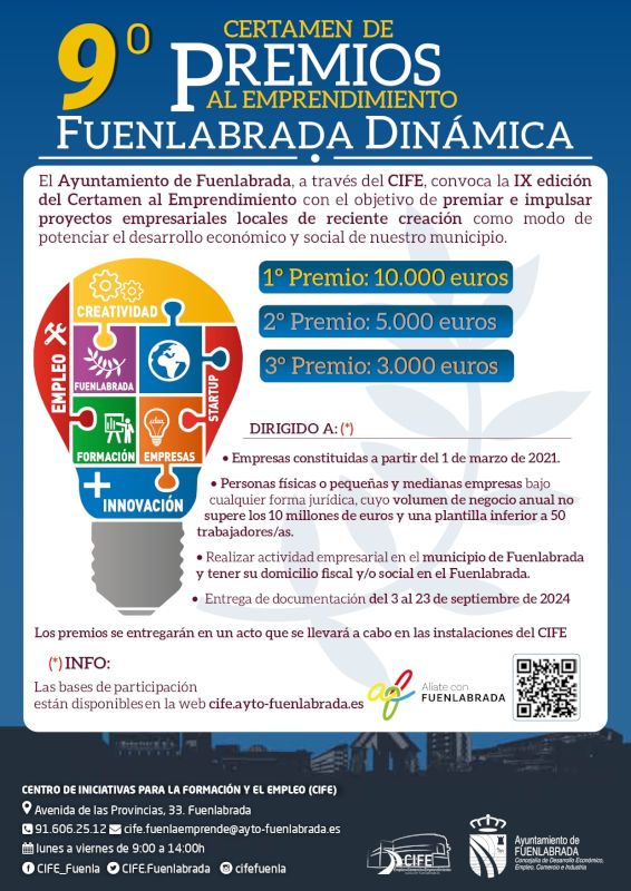 El Ayuntamiento de Fuenlabrada, a través del CIFE, ha convocado la novena edición de los premios al Emprendimiento, un certamen que quiere impulsar y reconocer el esfuerzo de emprendedores y empresas que, a través de su esfuerzo, contribuyen al crecimiento económico, a la creación de empleo y al progreso de la sociedad.