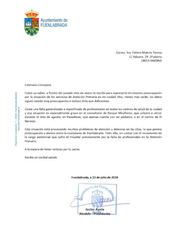El alcalde envía por segunda vez una carta a la dirigente regional denunciando la situación de los centros de salud fuenlabreños