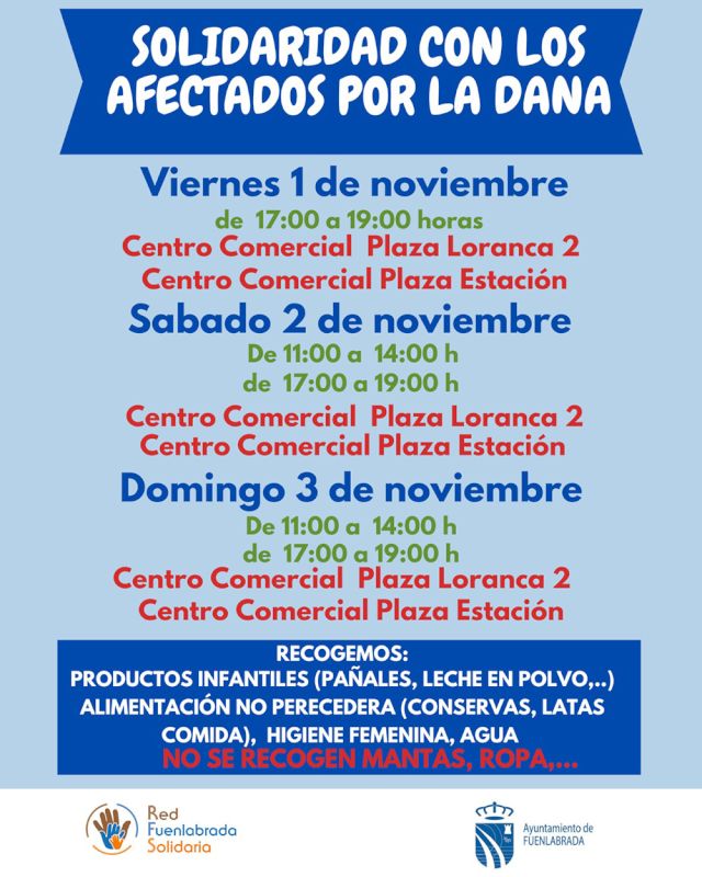 El Ayuntamiento de Fuenlabrada ha activado su Red Solidaria y ha lanzado un dispositivo de recogida de productos para enviar a los afectados de la DANA que ha asolado municipios de la Comunidad Valenciana, Castilla-La Mancha o Andalucía.