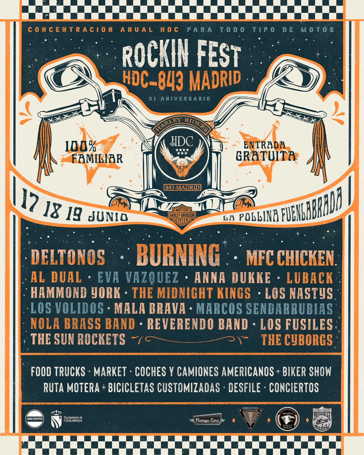 El Parque Municipal La Pollina acogerá los próximos días 17, 18 y 19 de junio el Rockin’ Fest HDC-843 Madrid, la multitudinaria fiesta Harley Davison que reunirá a 18 bandas legendarias como Burning, Los Deltonos o MFC Chicken, entre otras.