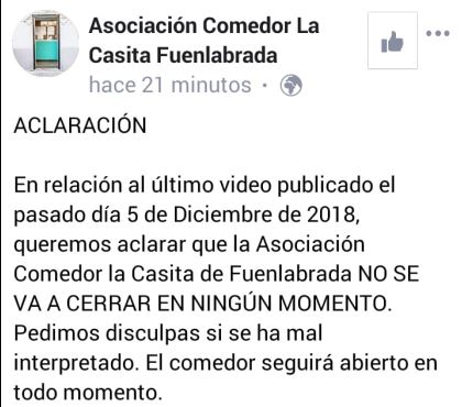 Por su parte, el Comedor Social 'La Casita', a través de sus redes sociales, ha publicado una nota negando que vaya a cerrar en el mes de febrero de 2019.
