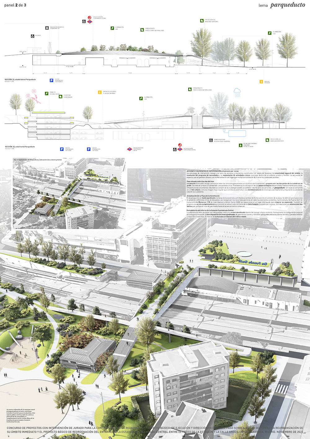 El proyecto ganador propone la construcción de una pasarela que arranca desde la Plaza de la Constitución, atraviesa Fuenlabrada Central y comunica con la calle de la Vía, donde se encuentran el hall de entrada al metro y al cercanías y el aparcamiento de vehículos que llega hasta la calle Grecia, por detrás del edificio de Hacienda en la calle Luis Sauquillo. En la parte central una gran escalera salvaría el desnivel de la zona y a los laterales dos largas rampas harán este espacio completamente accesible. Desaparece el tráfico rodado para dejar paso a una amplia zona rodeada de parterres y espacios estanciales. Debajo de este espacio se construirá un parking subterráneo para más de 300 coches.