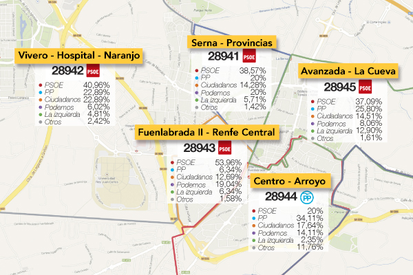 De acuerdo con los datos recolectados, cabe subrayar un imponente predominio de los socialistas fuenlabreños en el mapa descrito. Así, los barrios Vivero- Hospital- Naranjo, Serna- Provincias, Avanzada- La Cueva y Fuenlabrada II- Renfe Central, han demostrado barajar una intención de voto favorable al PSOE, imponiéndose frente al resto de fuerzas políticas. No obstante, las tornas han cambiado en el sector Centro- Arroyo, donde los populares han cosechado unas cifras del 34,11%. Así, la coyuntura política previsible actual muestra que, a pesar del patente predominio del PSOE, este necesitaría de nuevos aliados para retener la alcaldía.