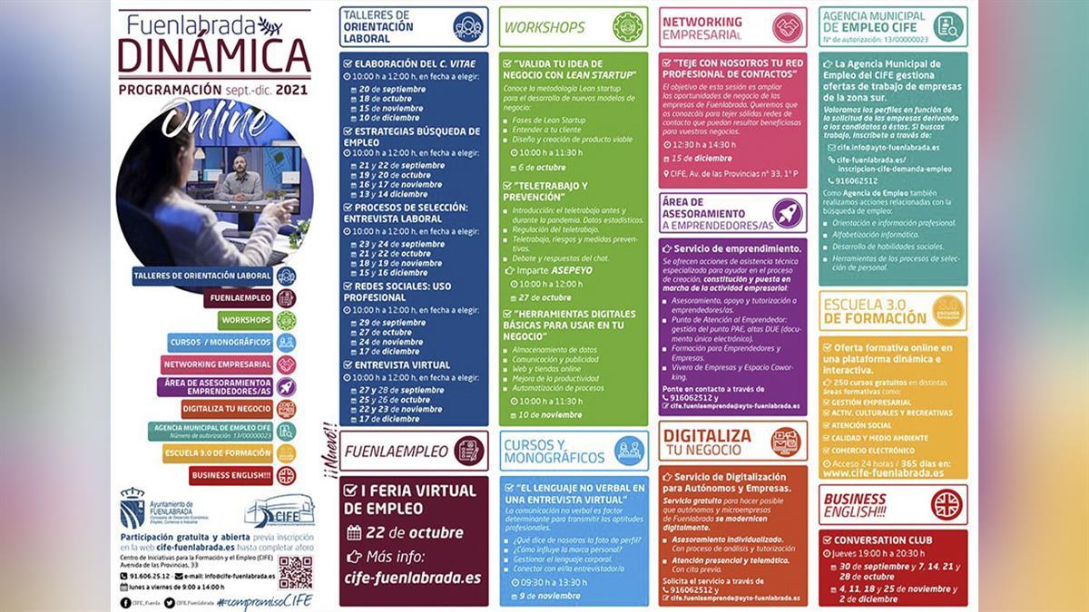 ¡Nueva programación de Fuenlabrada Dinámica! El Ayuntamiento de Fuenlabrada, a través del CIFE, oferta una nueva programación para el último trimestre del año con múltiples actividades formativas y con la novedad de la celebración de la I Feria Virtual para el Empleo.