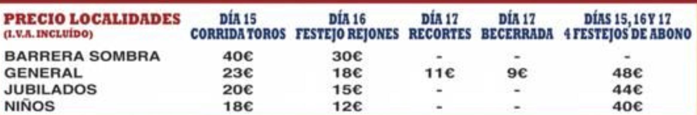 Las entradas se dividen en barrera sombra, general, jubilados y niños. De esta manera, para el día 15 los precios oscilan entre los 40€ para la mejor de las entradas (barrera sombra) y 18€ para los niños. El día 16, las entradas están entre 30 y 12 euros, para barrera sombra serán 30€, general 18€, jubilados 15€ y niños 12€. Sin embargo, para el día 17 solo se puede coger la entrada general que son 11€ para los recortes y 9€ para la becerrada.
