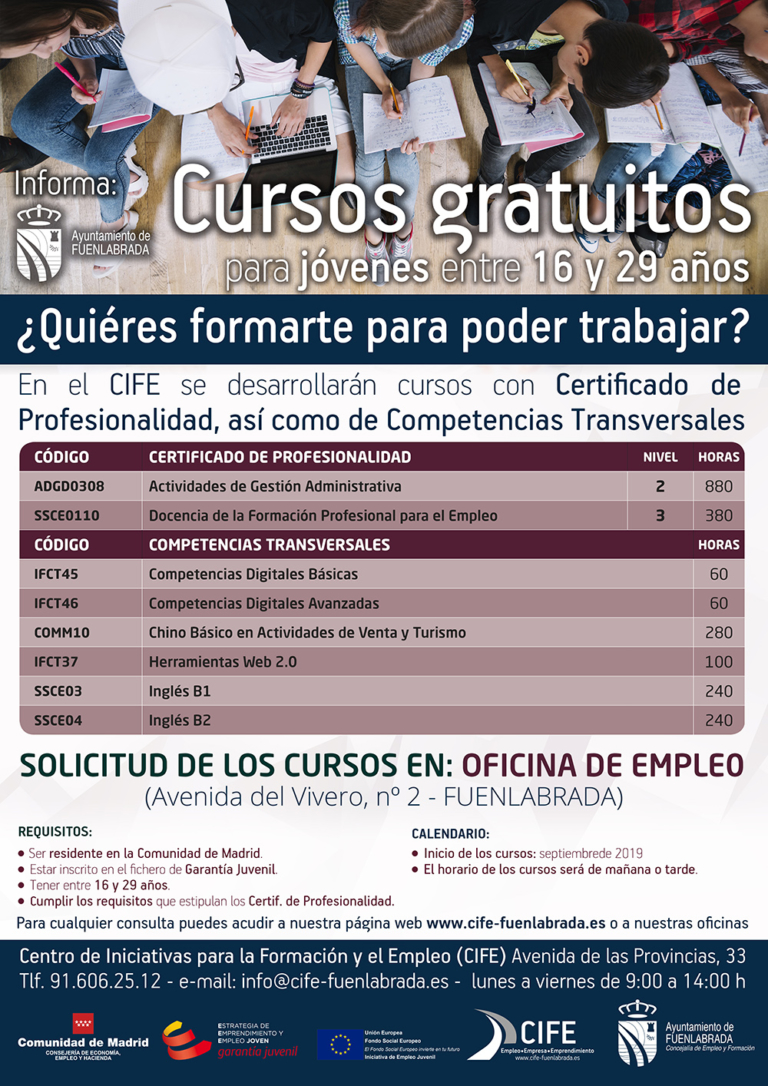 A partir de septiembre, los jóvenes de entre 16 y 29 años podrán aumentar sus conocimientos con los nuevos cursos de formación para el empleo que se ofrecen a través del CIFE de la localidad. Con estos cursos, los participantes obtendrán un Certificado de profesionalidad, así como uno de competencias transversales.