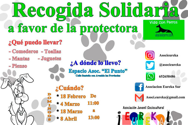 El domingo 18 comenzó una iniciativa de recogida de alimentos, más concretamente, pienso seco y húmedo para los perros atendidos en la protectora Vida con Perros. Las recogidas se realizarán los domingos 18 de febrero, 4 y 18 de marzo y el 8 de abril en el Espacio Asociativo El Punto. El horario será de 11:00 a 13:00 horas.