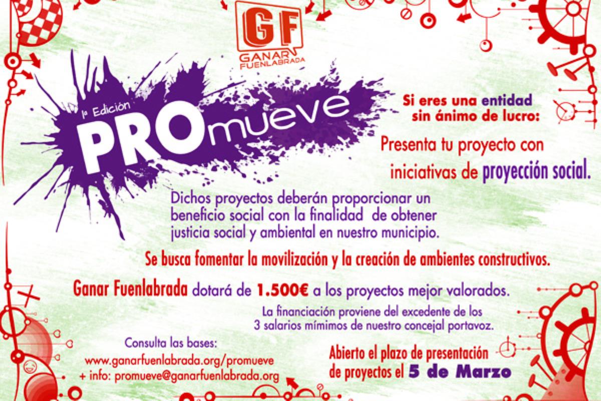 El grupo municipal Ganar Fuenlabrada presentará el próximo lunes una nueva iniciativa. El proyecto, bajo el nombre de PROmueve, “nace para ayudar a entidades sin ánimo de lucro a realizar sus proyectos en iniciativas de proyección social” en nuestra ciudad, con el objetivo de “acercarse a las necesidades de la ciudadanía y responder a ellas”, explican.