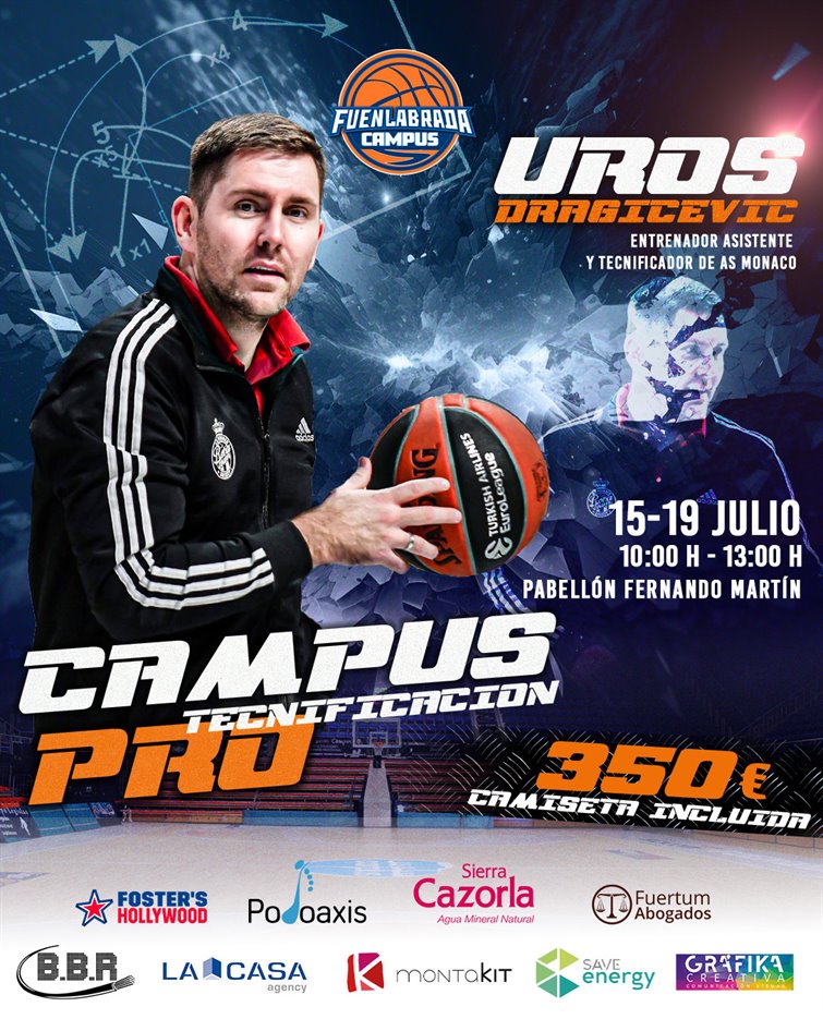 El Baloncesto Fuenlabrada abre las inscripciones para el CAMPUS PRO DE TECNIFICACIÓN que estará dirigido por Uros Dragicevic, entrenador ayudante del AS Mónaco de Euroliga. Se celebrará en el pabellón Fernando Martín del 15 al 19 de julio.