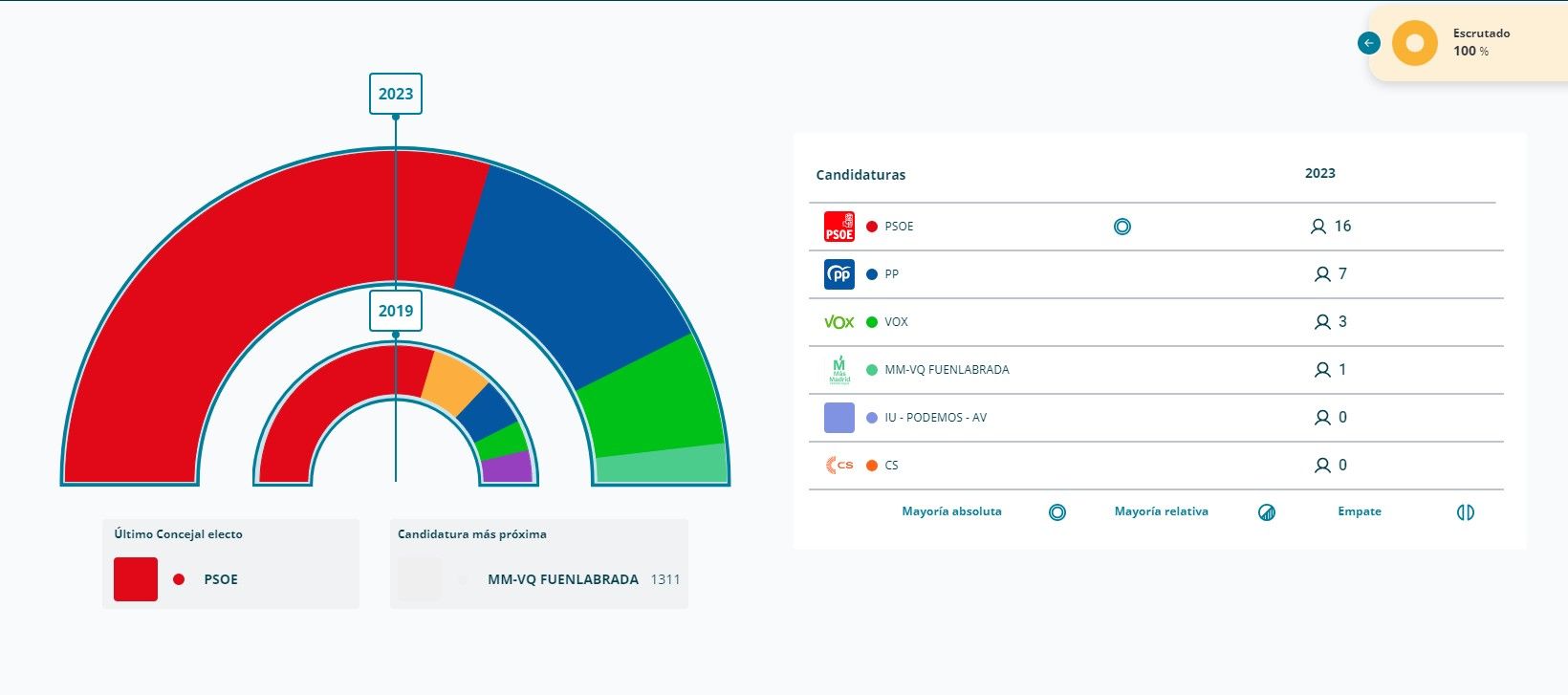 El PSOE seguirá gobernando el Ayuntamiento de Fuenlabrada durante 4 años más tras el amplio respaldo de la ciudadanía fuenlabreña al proyecto de Javier Ayala. Con el 100% escrutado, los socialistas renuevan su amplia mayoría absoluta de 16 concejales gracias al 54,35% de los votos (51.908 sufragios).