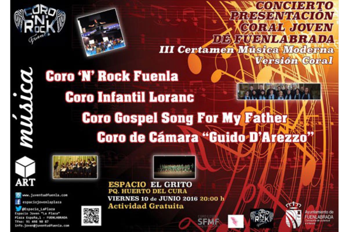 La coral Coro ‘N’ Rock Fuenla se presentará el 10 de junio a las 20:00 horas en el Espacio El Grito en Fuenlabrada (Parque Huerto del Cura) y es totalmente gratuito. Este espectáculo se encuentra dentro del III Certamen de Música Moderna Versión Coral, en el que además participan el Coro Gospel Song For My Ftaher, el Coro Infantil Loranca y el Coro de Cámara “Guido D’Arezzo”.