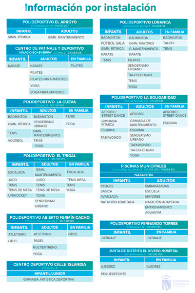 Las diferentes instalaciones ofrecer actividades para menores de 3 a 5 años, infantil de 6 a 14 años, para personas adultas mayores de 15 años y para personas mayores de 65 años. También se ofrece una amplia oferta para practicar deporte en familia.
