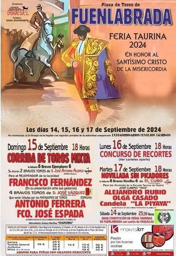 EL 15 de septiembre tendrá lugar en la plaza de toros portátil de la calle las Eras una corrida de toros mixta con un mano a mano de los diestros Antonio Ferrera y Francisco Javier Espadas frente a los toros de José Vázquez; y después habrá dos toros de José Antonio Alonso para el rejoneador local Francisco Fernández.